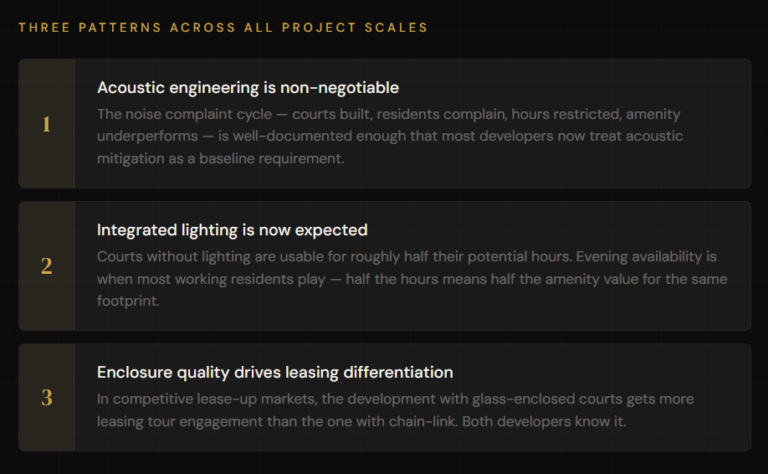 First, acoustic engineering is becoming non-negotiable for any project that places courts near residential units. The noise complaint cycle (courts built, residents complain, hours restricted, amenity underperforms) is well-documented enough that most developers now treat acoustic mitigation as a baseline requirement, not an optional upgrade.