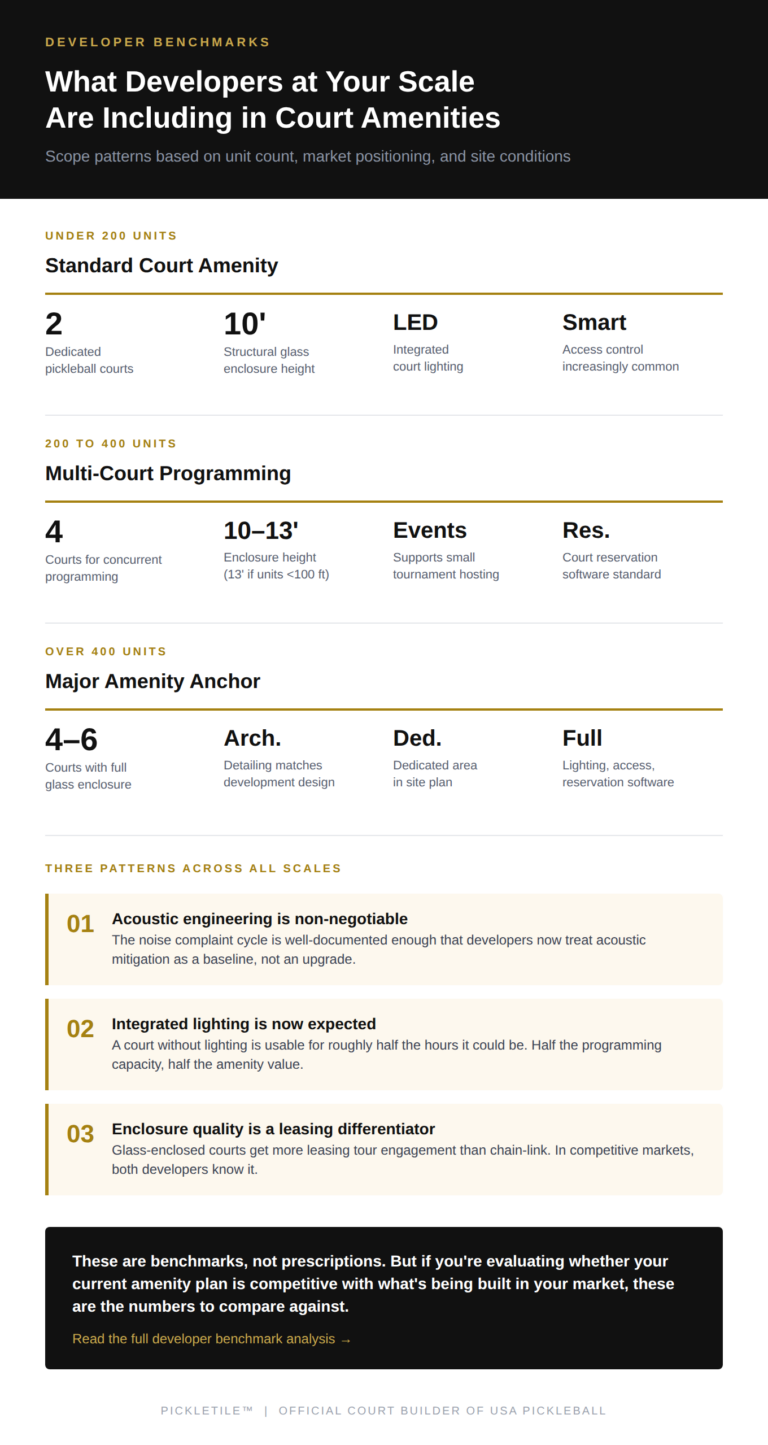 Projects between 200 and 400 units are trending toward 4 courts, enough to support concurrent programming (resident events, reserved play, and open court time simultaneously) without scheduling conflicts. The 4-court configuration also supports small tournament hosting, which is becoming a community activation tool for property managers. Acoustic enclosure height at this scale is typically 10 feet minimum, with 13 feet specified when residential units are within 100 feet of the courts.